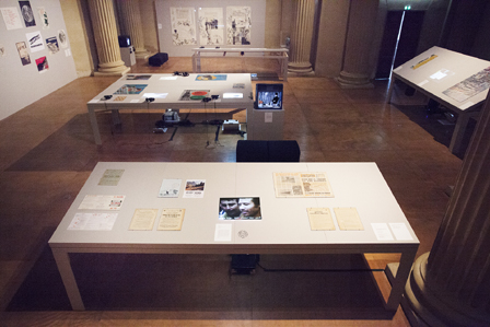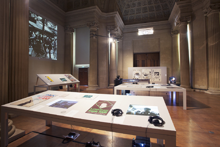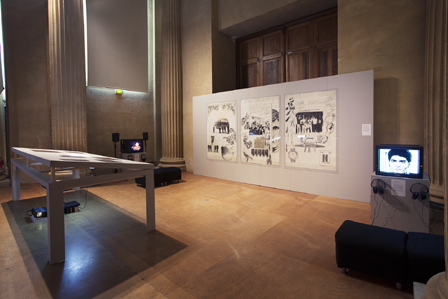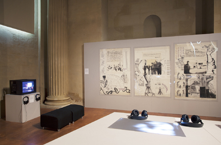 A l’origine, le projet Ma’aminim (les Croyants) s’inspire de l’identité sociale et politique du 93 et des relations à l’image qu’il a pu susciter, de manière directe et indirecte, concrète et métaphorique. Ici, la Seine Saint Denis n’est pas un sujet mais une occasion, un prisme d’enjeux disparates qui inspirent l’exposition sans la déterminer. Pour ce faire, la décision a été de travailler avec des fonds locaux : la collection vidéo du Conseil général, le musée d’Art et d’histoire de Saint-Denis, le musée d’Histoire vivante, l’Institut d’Histoire Sociale à Montreuil et les Archives Départementales de Bobigny (o๠sont déposées les archives du Parti Communiste Français, de la CGT, mais aussi d’ISKRA/SLON, société de production et diffusion fondée par Chris Marker et Inger Servolin). Cette concentration unique de ressources sur les luttes sociales et politiques qui ont agité la France au vingtième siècle est l’occasion d’éclairer quelques angles morts de l’histoire via des films militants, des clips, objets, des documents de propagande et des Å“uvres d’art. A partir de ces sources, il s’est agi de composer une exposition hantée par un contexte sans le traiter frontalement, établissant des associations libres entre des objets trouvés sur place, ou pas très loin, sans anticipation du résultat. C’est dire si le processus de recherche a ici autant d’importance que sa forme finale.